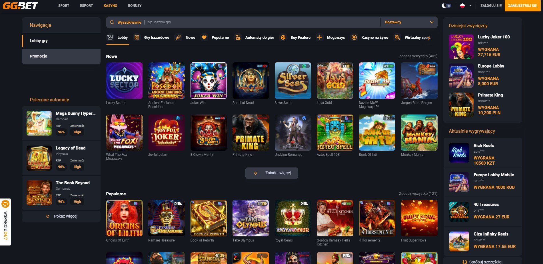 | Sloty | W ofercie GG Bet znajduje się ponad 800 automatów online | Egypt Goods, Divine Fortune, Big Bad Wolf |